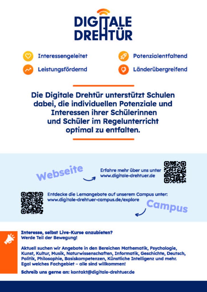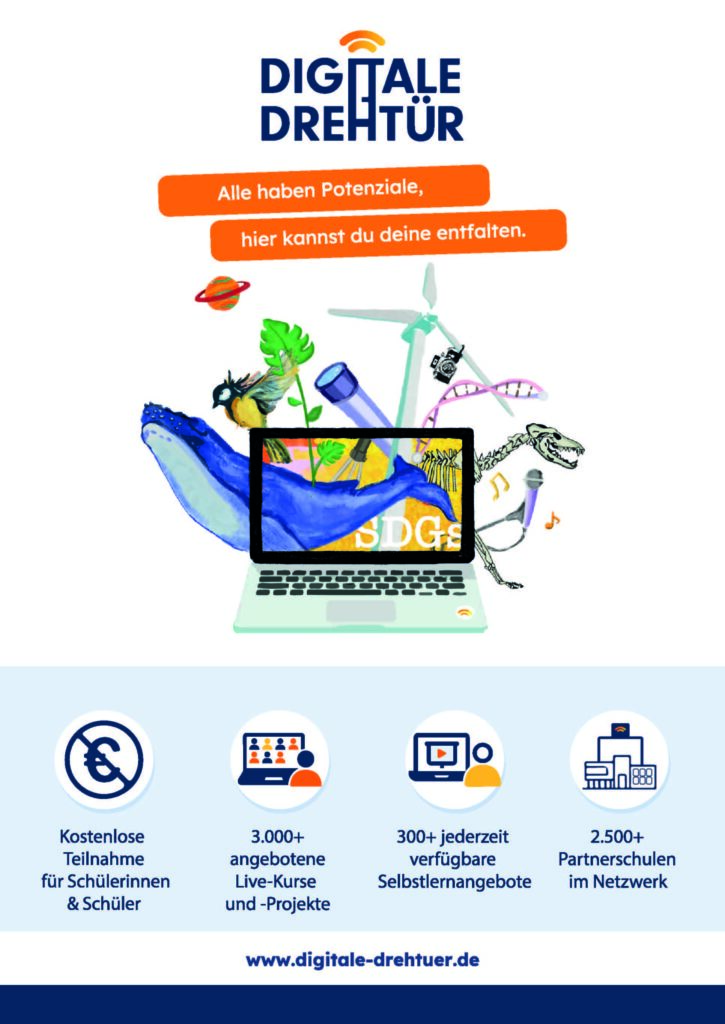 Die Digitale Drehtür ist ein länderübergreifendes, digitales Bildungsangebot für Schülerinnen und Schüler. Sie ergänzt unseren regulären Unterricht durch Online-Live-Kurse, Selbstlernangebote und Projekt-Formate, die sich an den Interessen und Stärken der Lernenden orientieren. Unser gemeinsamtes Ziel ist es, individuelles und selbstgesteuertes Lernen zu fördern, Kreativität zu stärken und wichtige digitale Kompetenzen zu entwickeln.